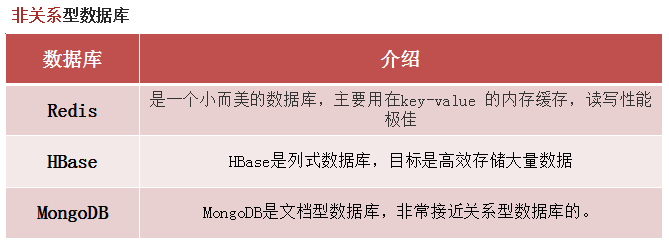 4) 常用的非关系型数据库有:Redis,Hbase,MongoDB