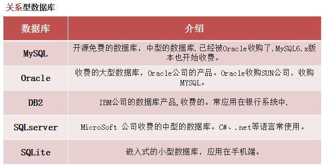 3) 常用的关系型数据库有:MySQL,Oracle,DB2,SQLserver,sqlite