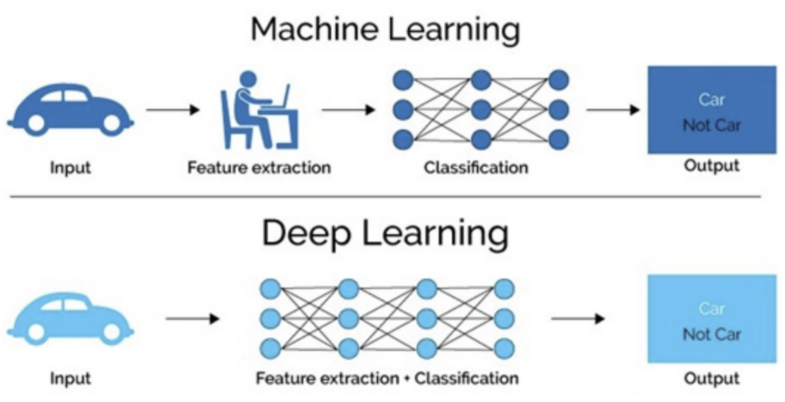 传统机器学习算法依赖人工设计特征,并进行特征提取;而深度学习方法不需要人工,而是依赖算法自动提取特征。